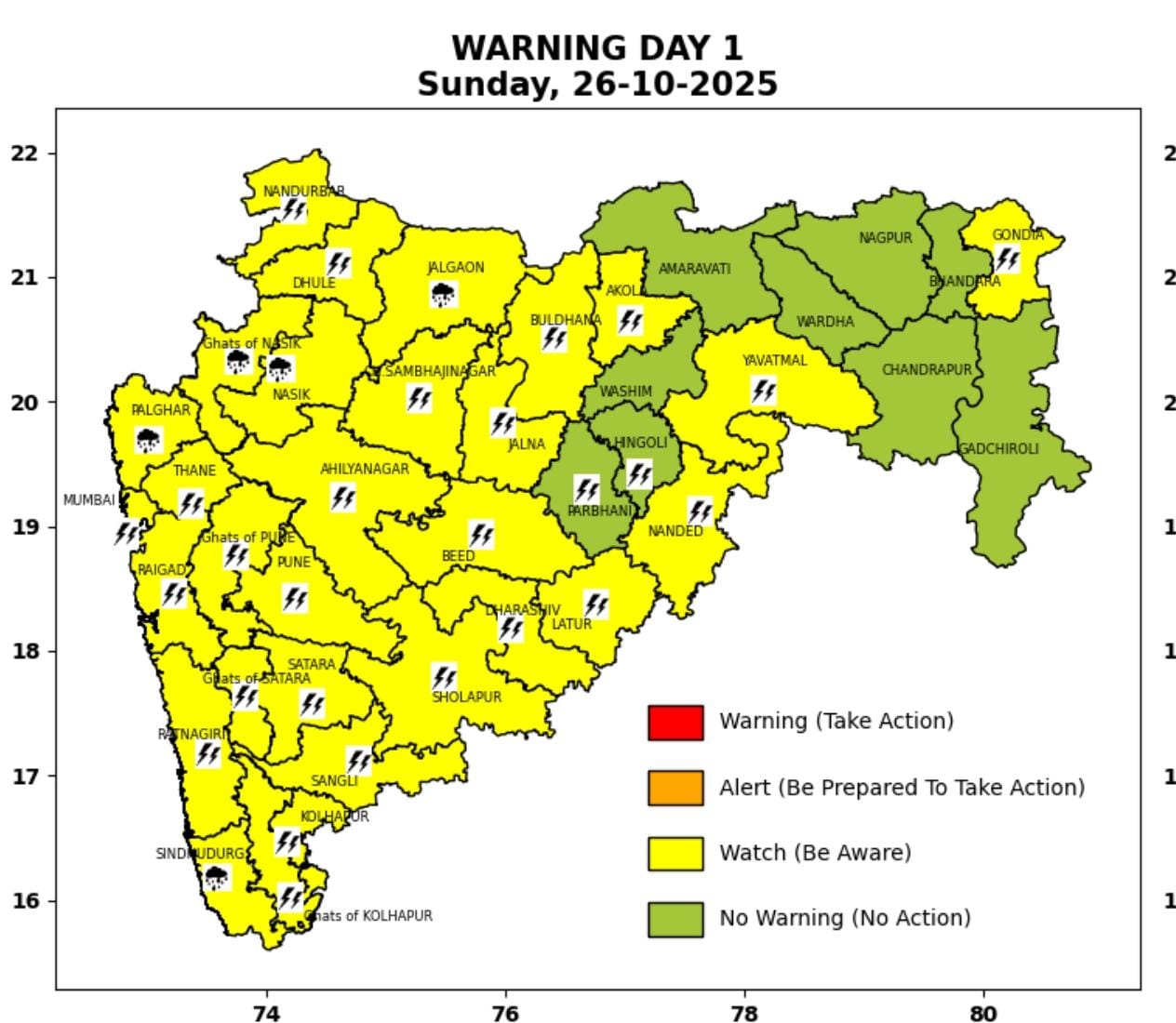 आज 26 आँक्टोंबर रोजी मराठवाडा, मध्य महाराष्ट्र, उत्तर महाराष्ट्र, संपूर्ण कोकण आणि विदर्भातील काही जिल्ह्यात पावसाचा यल्लो अलर्ट जारी करण्यात आला आहे…